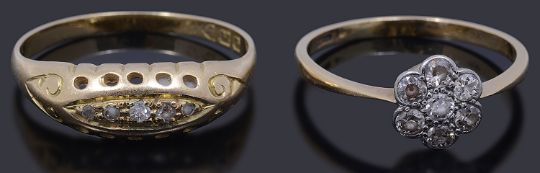 all grain set to knife shoulders and a polished shank marked 18ct and a Victorian 18ct gold five stone diamond boat shaped ring (2)