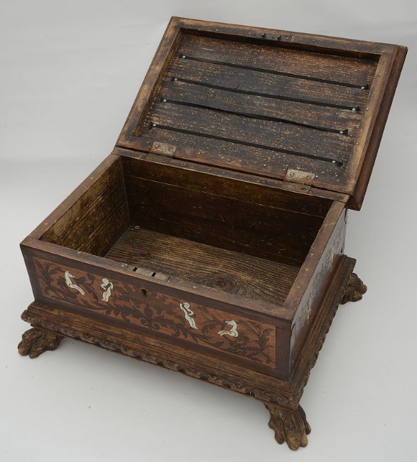 Condition: Lock present but no key.Section of damage and loss to marquetry on lid Crack running through centre of lid. background wood of marquetry lid has dried with cracks and small losses. Losses to inlaid ivory to rear and also with losses to marquetry. A crack runs through the rear. Slight chip to carved border right hand lower side edge. Slight damage to veneer right rear side edge. Please Note that the cracks to lid and base have recently opened up and will require some repair.
