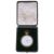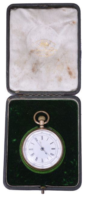 having a white enamel dial, Roman numerals and minute track, engraved crest and engine turned decoration to back case, gilt metal cuvette and bow, in fitted case