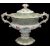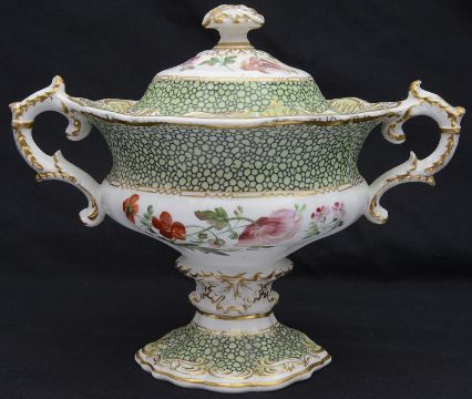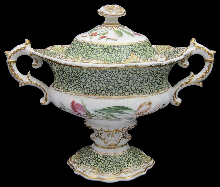 A Copeland & Garrett late Spode Felspar porcelain cream twin handled pedestal sauce or cream tureen c.1835pattern 5743, decorated with shagreen style borders and floral sprays, black printed factory markheight 18 cm.Condition: Generally in good condition, no major cracks, hairline crack to lid knop, tiny nibbles to interior rim of tureen, small crack to glaze surface on shagreen border.