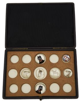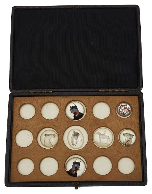 including two small dogs, two horses heads, a jockey on horse and enamel monogram example in box (7)