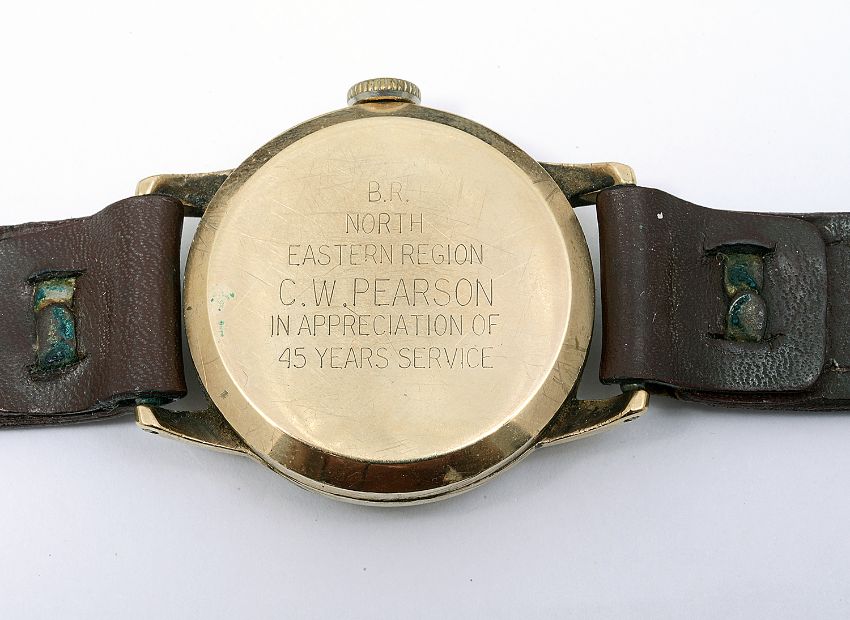 a champagne dial, Arabic numerals and blue spade hands, inscription verso, to a brown leather strap