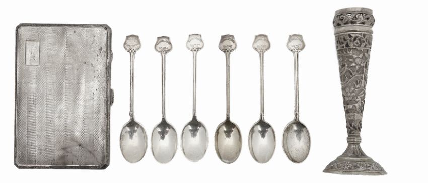 comprising a large engine turned cigarette case, Birmingham, 1950 by Joseph Gloster Ltd, a late 19th/early 20th century Indian silver spill vase of tapering form, having pierced rim and embossed with animals amongst scrolling foliage and a set of six Masonic coffee spoons, the terminals mostly engraved 'Kampala Lodge No7167', (8)