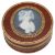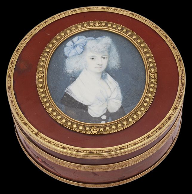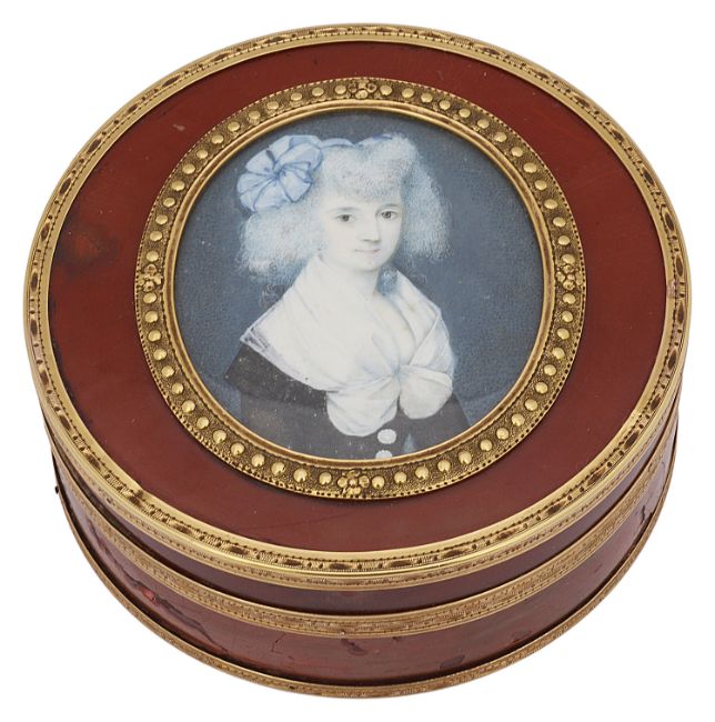 of circular form, red lacquered ground, gold mounts, with a central oval portrait miniature of a lady with a blue rosette to her hair, within a gold mount with a beaded border, tortoiseshell lined to the interior