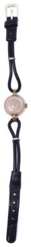 circular dial with baton markers, bevelled glass, tapering lugs to a two row black leather strap