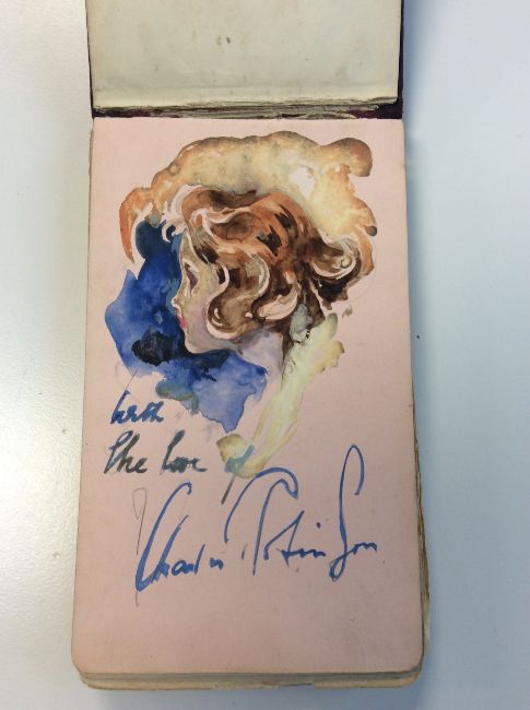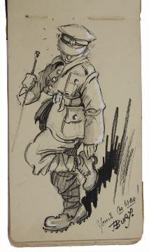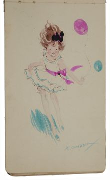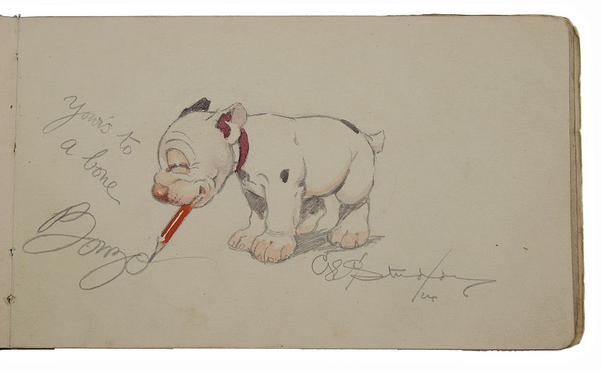 London Sketch Club. An autograph album of approx. thirty five original signed sketches and watercolours by members of the club belonging to Miss Barbara Dickson to include George Studdy 'Bonzo', Charles Robinson, Heath Robinson et al. c.1920 containing sketches and watercolours by Charles D. Ward (1872-1935), Charles Robinson (1870-1937), Edgar L Pattison (1872 - ?), A.K. Macdonald, ? Harrison, Wilton Williams, W. K. Haselden, Percy V Bradshaw, Fred Buchanan, I Hassalt, Harold Earnshaw, Arthur Ferrier, George Studdy 'Bonzo', J Bury, Thomas Downey, Aubrey Hammond (1893-1940), Alfred ?, J Mac Wilson, H. Cowhan, Alex Lawson, E Lander, Herbert Pierpont, W. Heath Robinson (1872-1944) 'The Young Ostrich', E R Brightwell, Fred Taylor, George Pailly, Rupert Harvey, Walter Churcher, etc.