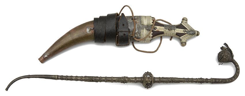 comprising a six strand necklace suspended with pendants, a purse mounted with a green hardstones, a large bangle, a four stand necklace, three chokers, a twisted cuff bangle, a coin ring, another ring, a headdress ornament, an opium pipe and a Jambiya dagger, (qty)