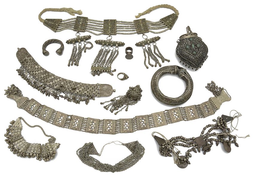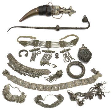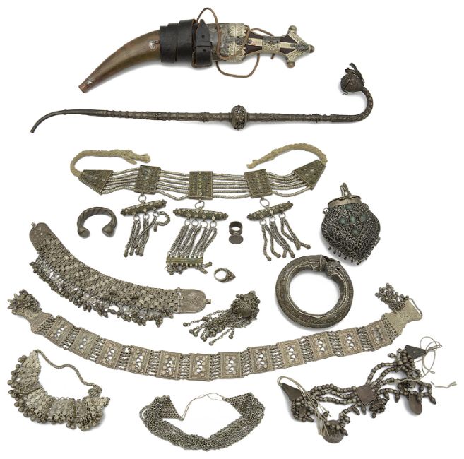 A collection of Yemeni Bedouin white metal jewellery and other items