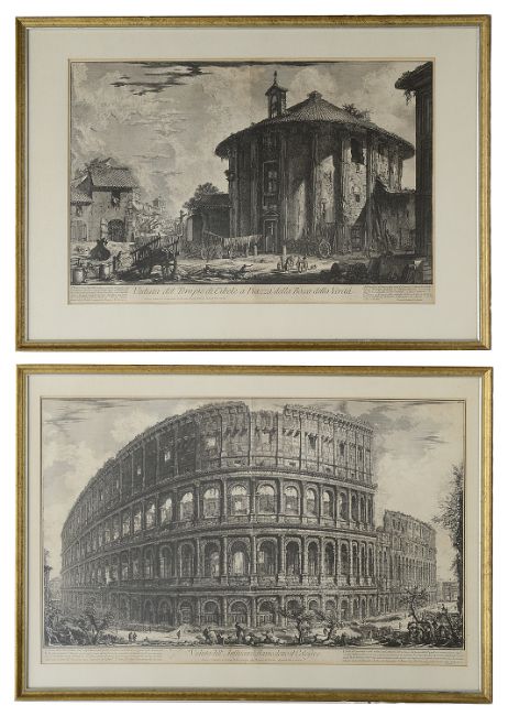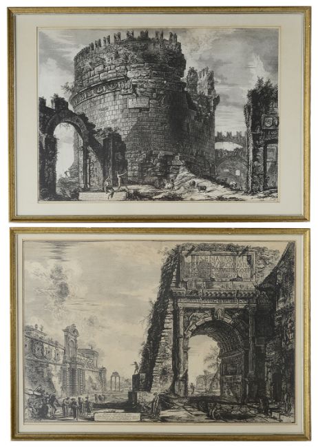 six etchings 'Veduta del Campidoglio di fianco','Veduta dell'Anfiteatro Flavio, detto il Coloseo','Veduta dell'Arco di Tito', 'Veduta del Tempio di Cibele a Piazza della Bocca della Verita', 'Sepolcro di Cecilia Metella', 'Avanzi di un antico Sepolcro, oggi detto la Conocchia', mounted, framed, (6)