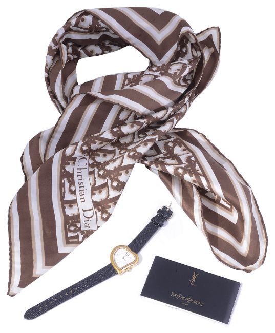 with heart shaped bezel and a white dial, printed Yves Saint Laurent as numerals, with a later added lizard effect strap and Guarantee card, No. 03290, together with a Christian Dior brown and caramel silk scarf, printed with the Dior logo (2)