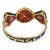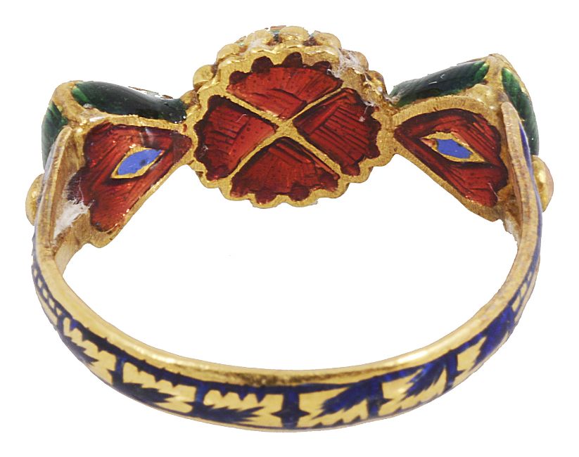 the central oval rose cut foiled back diamond rub set to an enamel and bead border, flanked by two step cut foiled back diamonds, rub set in a closed back setting enamelled in red foliate design, the shoulders and shank enamelled in blue and highlighted with a gold decoration