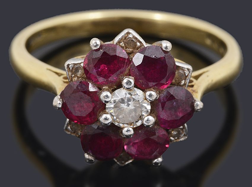 centrally set with a brilliant-cut diamond to the surround of six circular-cut rubies each separated by a a diamond point, 18ct yellow gold hallmarked shank