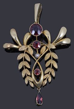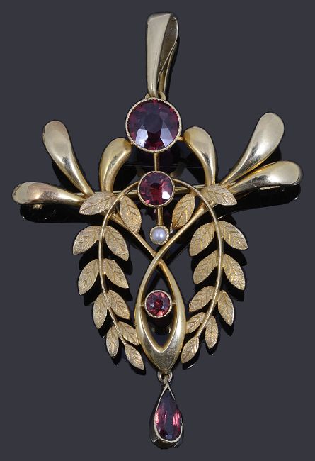 three graduated central circular cut garnets and a seed pearl, all millegrain set to an open leaf and scrolling frame with a further garnet pear shaped drop, with bale and brooch fitting to the reserve marked 15ct