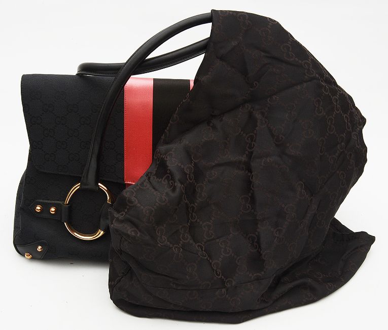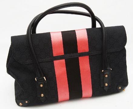 with maker's monogrammed black canvas exterior and neon pink and black satin stripe, twin handled with black leather trim and large horse-bit flab closure, with sectioned zipped compartment the interior, with outer dust bag and Gucci carrier bag, authenticity number 129499001998