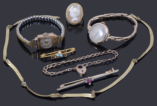 Condition: Bar brooch: approx 14ct, necklace has broken links in several areas, ruby is too small to assess possibly synthetic, watch not working, other items have wear consistent with age