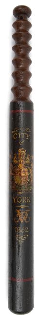 [THIS LOT IS WITHDRAWN]A Victorian 'City of York' painted turned wood truncheontransfer decorated with the Royal coat of arms and painted City of York with VR cypher and dated 1862length 43.4 cm.Condition: Some flake chips to painted decoration