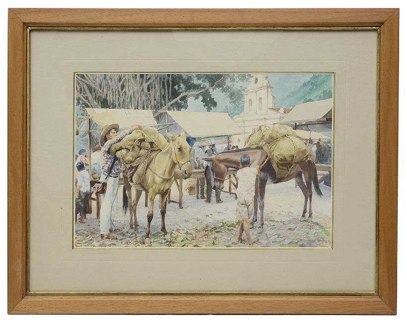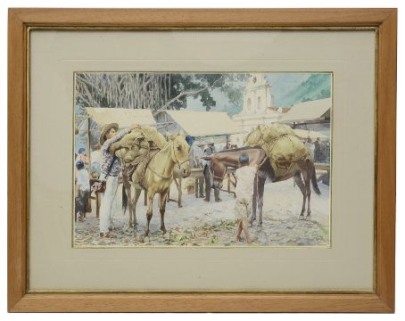 'South American market scene with packhorses', watercolour, signed and dated 1968 bottom right, mounted, framed