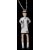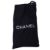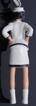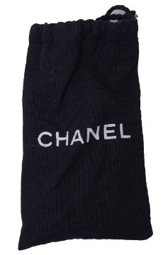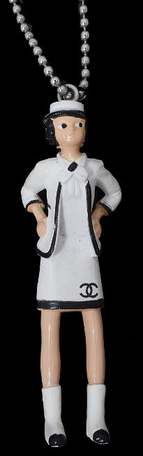 featuring a Coco Chanel figure, dressed in a classic white and black Chanel suit, suspended on a ball chain from the 2003 Chanel collection, with Chanel pouch