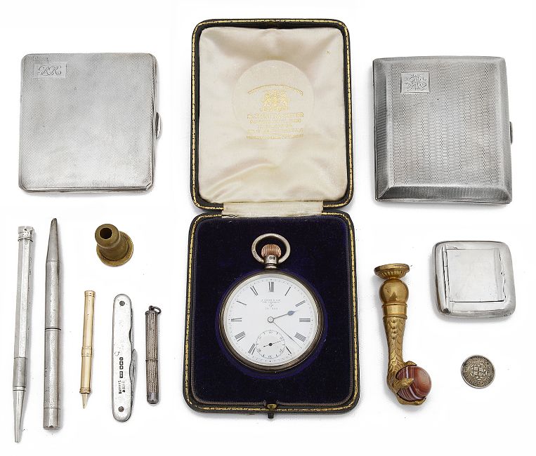 comprising a 9ct gold propelling tooth pick, two engine turned cigarette case, initialled, a small square plain curved snuff box, Birmingham, 1902 by William Ltd, interior gilt, two propelling pencils, a silver pocket knife, an engine turned twist action toothpick, a cased open faced keyless pocket watch signed S Smith & Son "The Charing", case back initialled, a gilt metal and agate ball and claw desk seal etc. (qty)