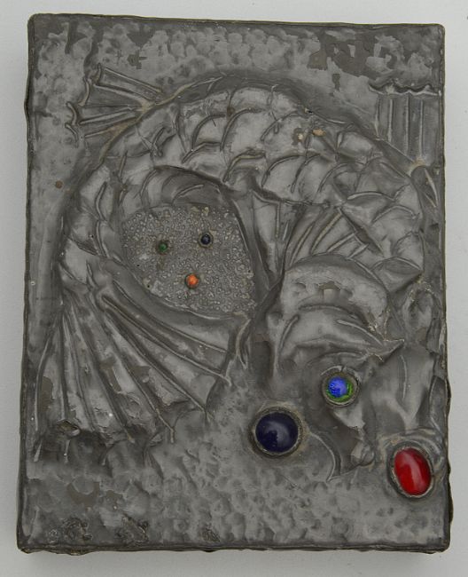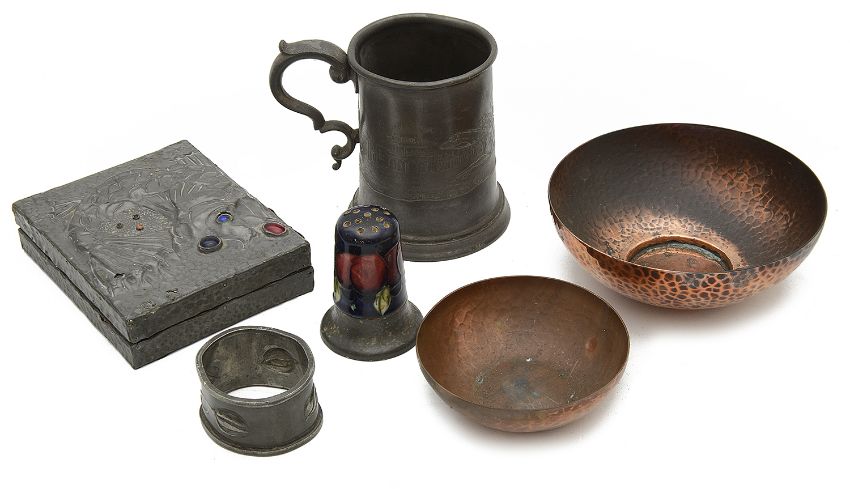 the Tudric pewter base of the pepper pot numbered 01527, one copper bowl stamped Newlyn, the other stamped JHG together with a Tudric pewter Napkin ring decorated with flowers, a hammered pewter clad cigarette box decorated with a fish and coloured glass cabochons and a 19th century pewter half pint mug cast with a horse racing scene, (6)