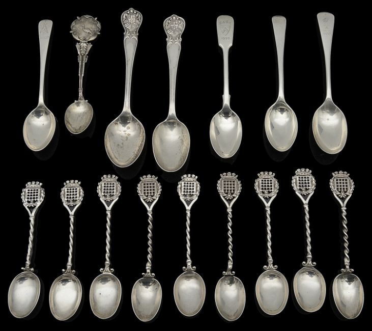 An Edwardian matched set of nine silver coffee spoons with Palace of Westminster Portcullis terminals and various other mostly rifle club prize teaspoons