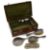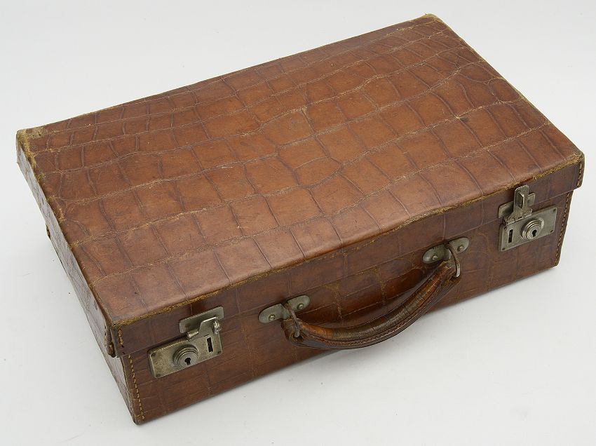 Condition: Back of clothes brush easily becomes detached but clips back on. Some movement to silver mount on one hair brush, both brushes with some damaged/absent bristles. Crocodile case with wear and scuffs to edges but in fair condition. The scent bottle has an absent cap and associated top from another jar