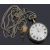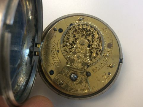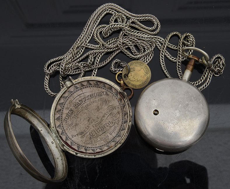 circular white enamel dial with black Roman numerals, minute track and gold hands, fusee movement, No 722 signed John Hardy Preston, attached a silver flat curb link watch chain