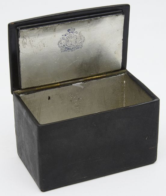the hinged lid painted with peasants seated at a table outside, interior tin lined