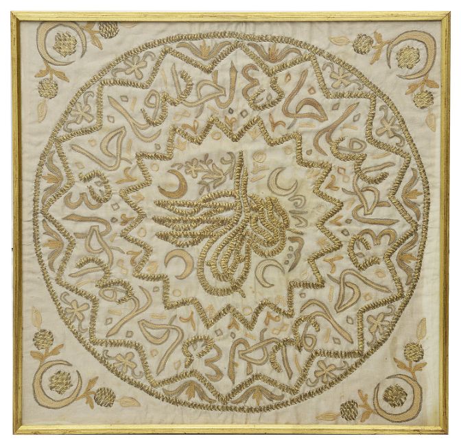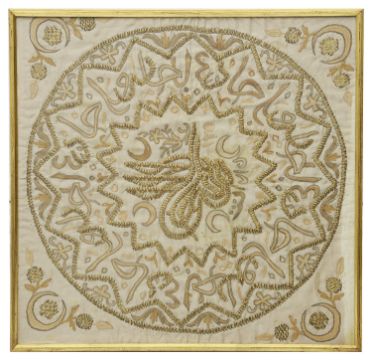 a silk muslin panel possibly from a dress panel embroidered with metallic and cream coloured threads with the Sultans tughra to the centre, further crescent moons, flowers and Arabic lettering in a circular form, framed and glazed