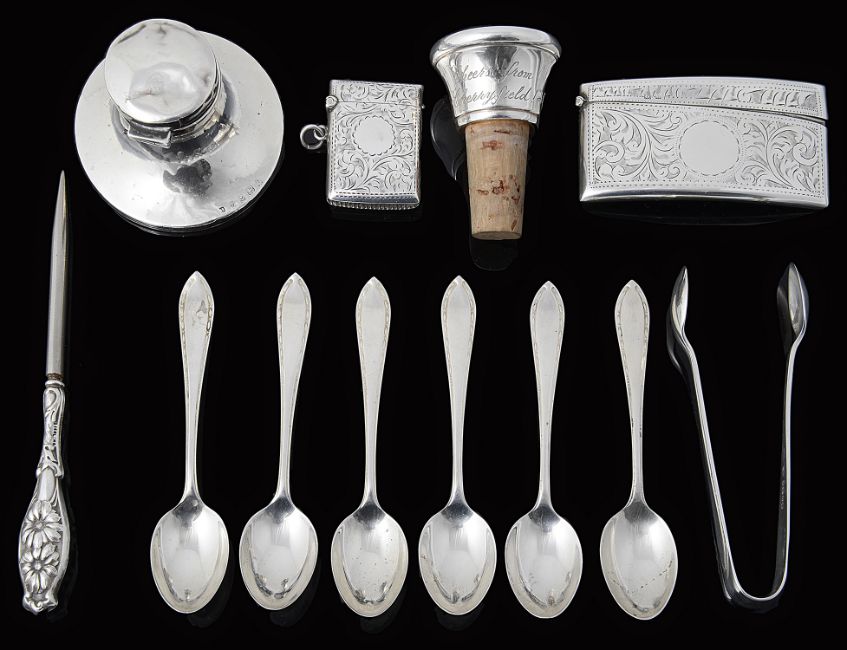 comprising a foliate engraved vesta case, Birmingham, 1925 by Joseph Gloster Ltd a foliate engraved curved card case Birmingham, a set of six coffee spoons with matching tongs, a small capstan inkwell a bottle stopper with linear engine turned decoration engraved 'Cheers form Cherryfield', etc., (qty)