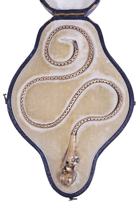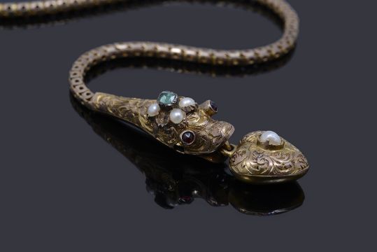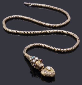 designed as an articulated serpent, the head rub set with seed pearls and a oval cut emerald, engraved through out, cabochon red eyes holding in it's mouth a engraved heart shaped pendant set with a rub set seed pearl, tongue clasp in original fitted case