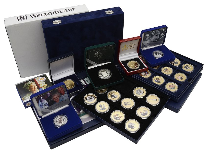 2006 Eightieth Birthday crown, 2007 Diamond Wedding Piedfort Crown, 2007 Diamond Wedding crown, 2007 Nauru Diamond Wedding 5 dollars, 2008 Tristan Da Cunha gold plated 'Queens Titles' crown, together with the 2011 The Royal Wedding 24ct gold plated cupro-nickel coin set, 2012 Diamond Jubilee 24 carat gold plated copper coin set, The Cooks Islands 24ct gold plated cupro-nickel coins: 2007 Diamond Wedding Photographic Portrait set, 2007 Wedding Day Portrait Five Dollars and 2012 Diamond Jubilee Five dollars, etc., mostly in capsules with certificates in fitted cases, (qty)