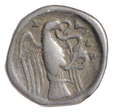Head of the nymph Chalkis to right / Eagle standing to right with open wings, pecking at snake held in its talons.