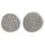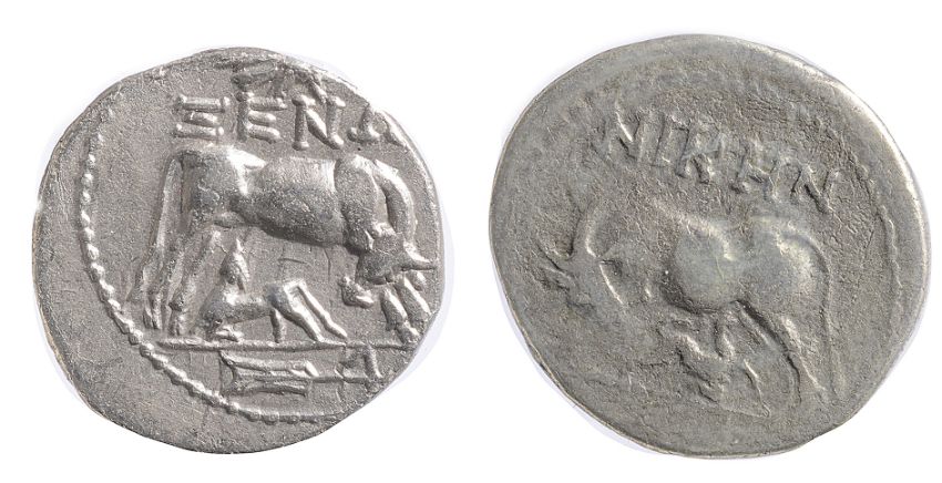 cow standing left, looking back at suckling calf standing right below NIKHN above / Double stellate pattern within slightly curved double linear square, (2)