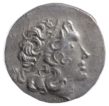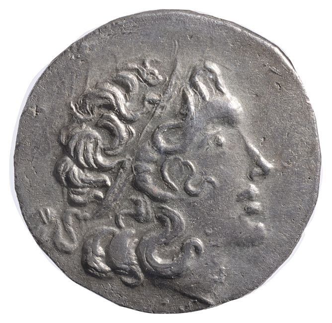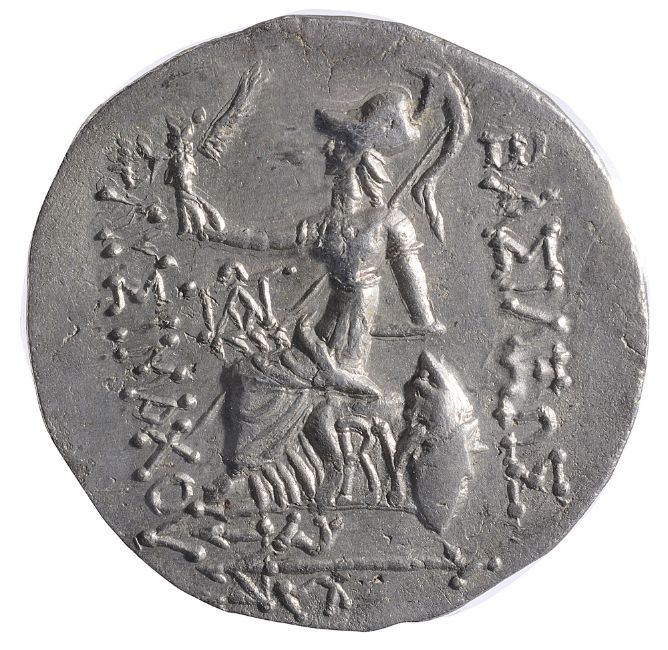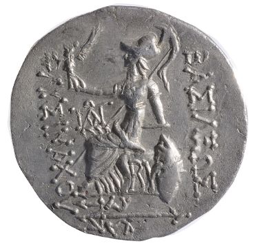 Diademed head of deified Alexander III right / Athena seated left, Nike in right hand crowning royal name, left arm leaning on large grounded shield, transverse reversed spear in background, BY under seat, filleted trident left below ground line
