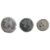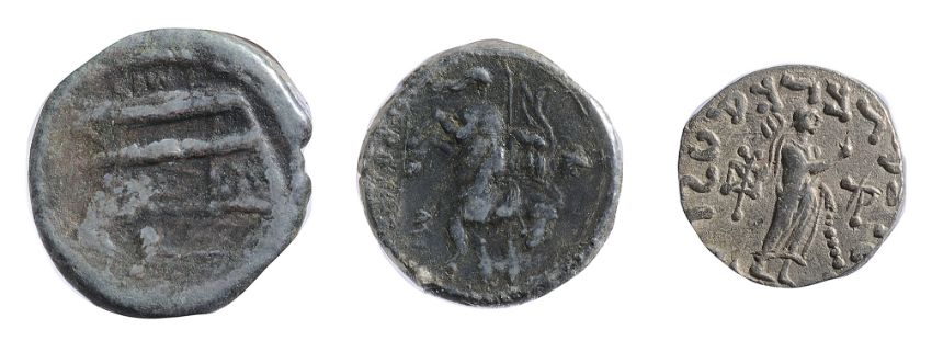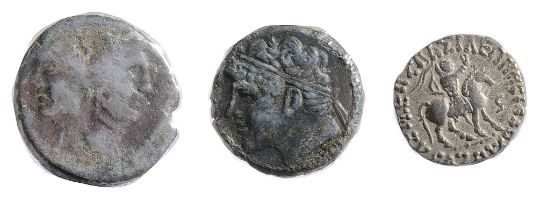 King on horseback riding to right, wearing cataphractus and holding whip aloft / Zeus standing to right with right arm extended and sceptre over left shoulder, monogram to left, (3)