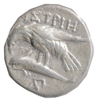 Two young male heads facing, side by side, one upright the other inverted / Sea eagle standing on dolphin which it attacks with its beak