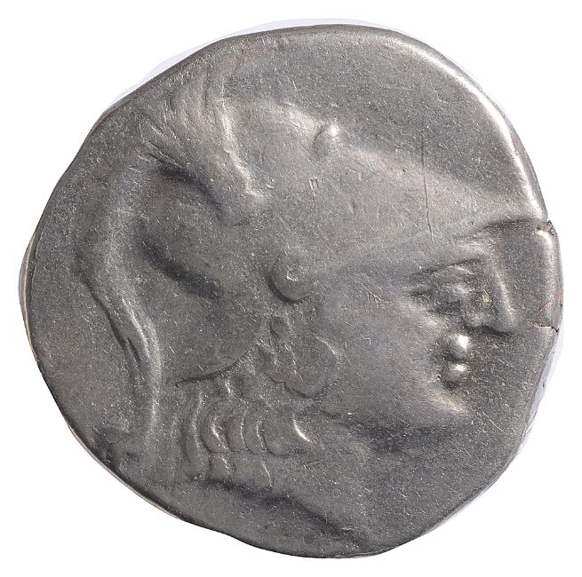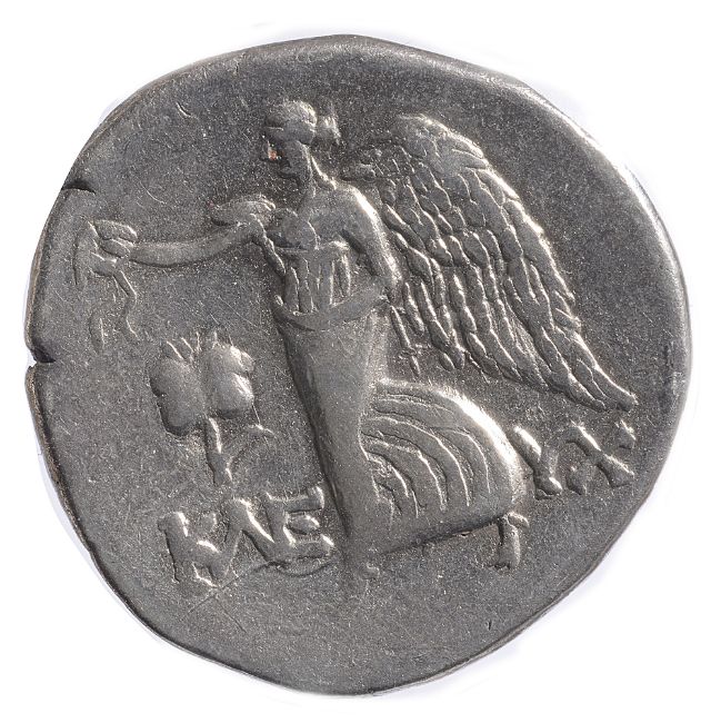 Head of Athena right, wearing crested Corinthian helmet / Nike striding left, holding wreath; in left field, pomegranate; K?E-YX in left and right lower fields.