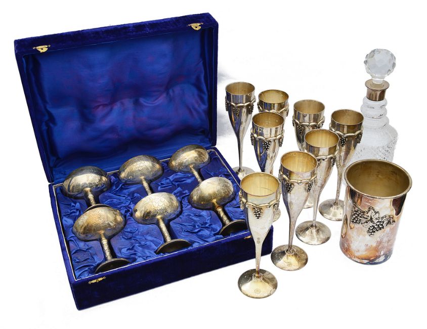 A modern silver mounted crystal decanter and stopper together with a set of six plated champagne coupes in a fitted case and a set of six plated champagne flutes with a matching bottle holder