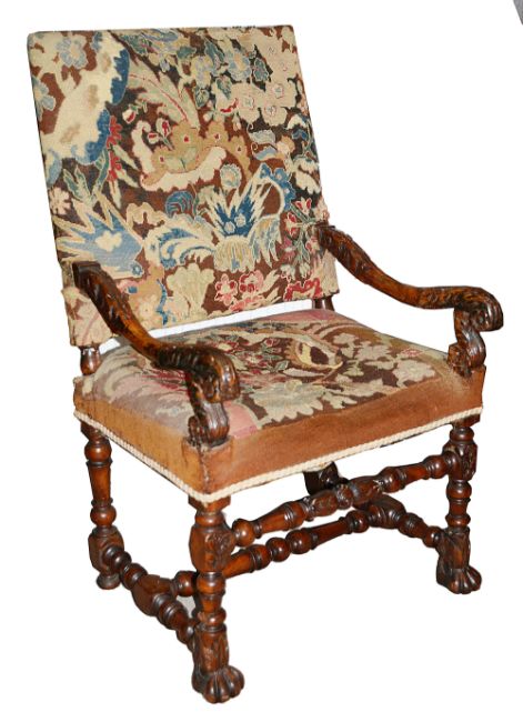 A late 17th century Flemish walnut and tapestry open armchair rectangular back and seat covered in needlework tapestry, swept leaf carved scroll arms, on turned legs united by a high front stretcher and conforming H understretcher, on lion paw forelegs