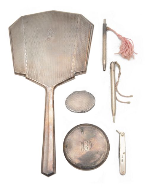 comprising a plain circular tobacco box, Birmingham, 1897 by John Milward Banks and bearing Banks flower trademark, interior gilt initialled together with an engine turned Art Deco hand mirror, an engine turned oval pill box, an engine turned Life-Long propelling pencil and a similar ball point pen and a silver folding steel bladed pocket knife, (6)