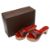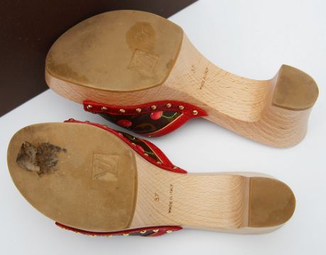 monogrammed strap with gold toned studs interspersed with cherry detail, with red suede sole and wooden heel, size 37, in original fitted box