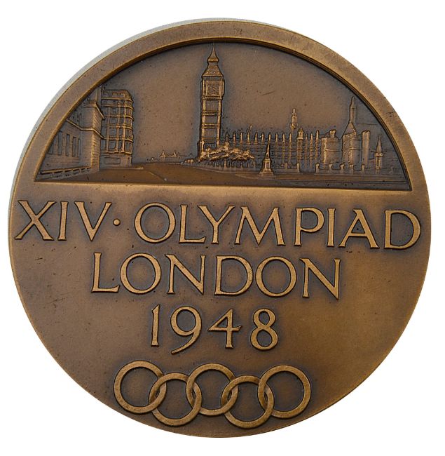 with a view of the Palace of Westminster above 'XIV OLYMPIAD LONDON 1948, reverse a quadriga