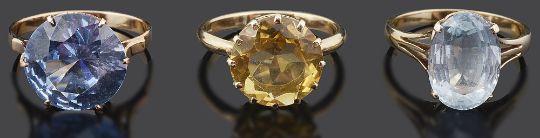 including an oval aquamarine ring, yellow metal mount tests for gold and a large circular blue zircon dress ring, mount stamped 14K (3)