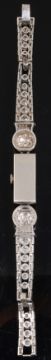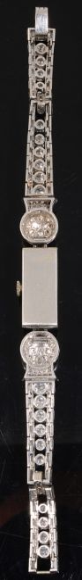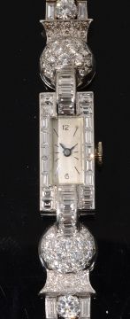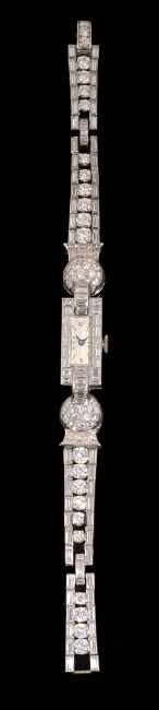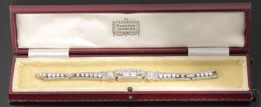 A stylish Art Deco diamond cocktail watch, the rectangular dial with Arabic and baton markers to the baguette-cut diamond-set surround, the integral baguette-cut diamond-set arched lugs to an articulated brilliant-cut diamond-set thistle-inspired sphere, each link of the flexible tapering strap comprising a central brilliant-cut diamond with a baguette-cut diamond to either side to the diamond-set arched clasp, associated leather and gilt tooled case for Harrods, Londonlength 17cm, gross weight 38.7gCondition: Overall condition very good. The bracelet strap has good flexibility .Diamonds have good clarity (generally VS) and good colour (H/I colour with some fluorescence).Largest brilliant-cut diamonds each spread 0.25cts approximately (4.08mm x 2.18mm).Bracelet Clasp tests as high carat white gold.Watch case tests as platinum, though apparently unmarked. Movement of watch untested but stamped 'Swiss', and '17 RUBIS'.