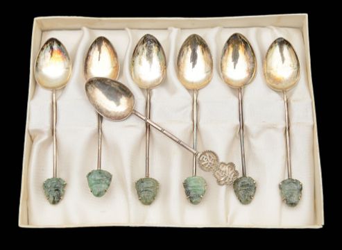 having bamboo stems, the terminal mounted with green hardstone carved buddhas, in a fitted case together with another silver coffee spoon with Chinese character terminal, (7)