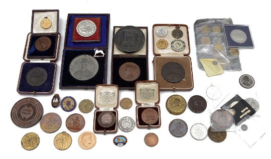 A collection of mostly 19th century and later commemorative and prize medals together with tokens, coins and other items