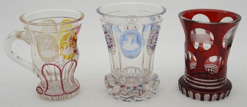 first of flared faceted form with a petal foot, the body of the beaker with medallions of alternating geometric star patterns and etched designs showing 'GlŸck' and a cornucopia, 'u. Freude' with a lyre and basket of flowers, 'Liebe' and a burning torch, second a ruby glass beaker of flared form with circular ribbed foot, oval reserves to the body containing etched views of landmarks in Franzensbad, third a clear glass cup with handle, of waisted form with facets and oval reserves coloured red and yellow and etched with allegorical scenes and the crowned initials 'H.T.', (3)