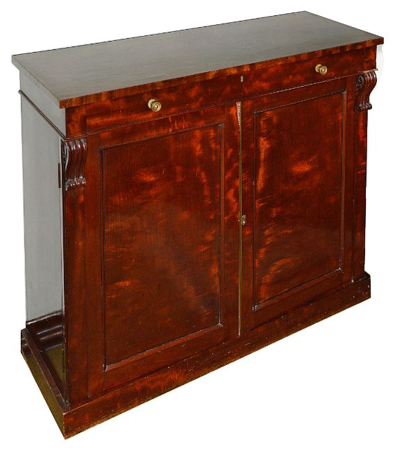 Condition: Fair condition. Slight loss / chip to the veneer top right corner of left cupboard door. Lock replaced. Minor losses to moulding strips