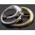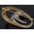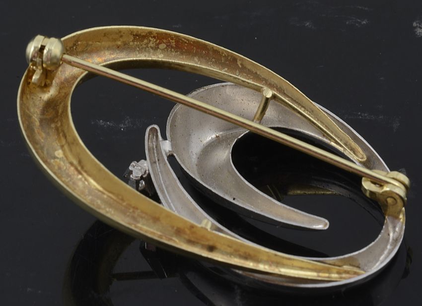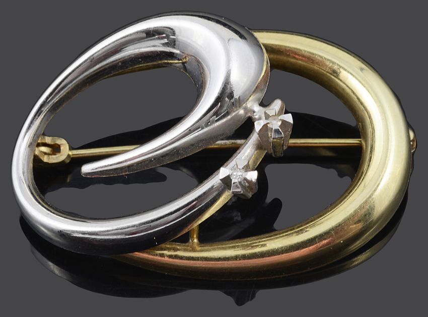 of yellow and white gold stylised scroll form set with twin diamond points, marked to reverse .585, maker A.D.